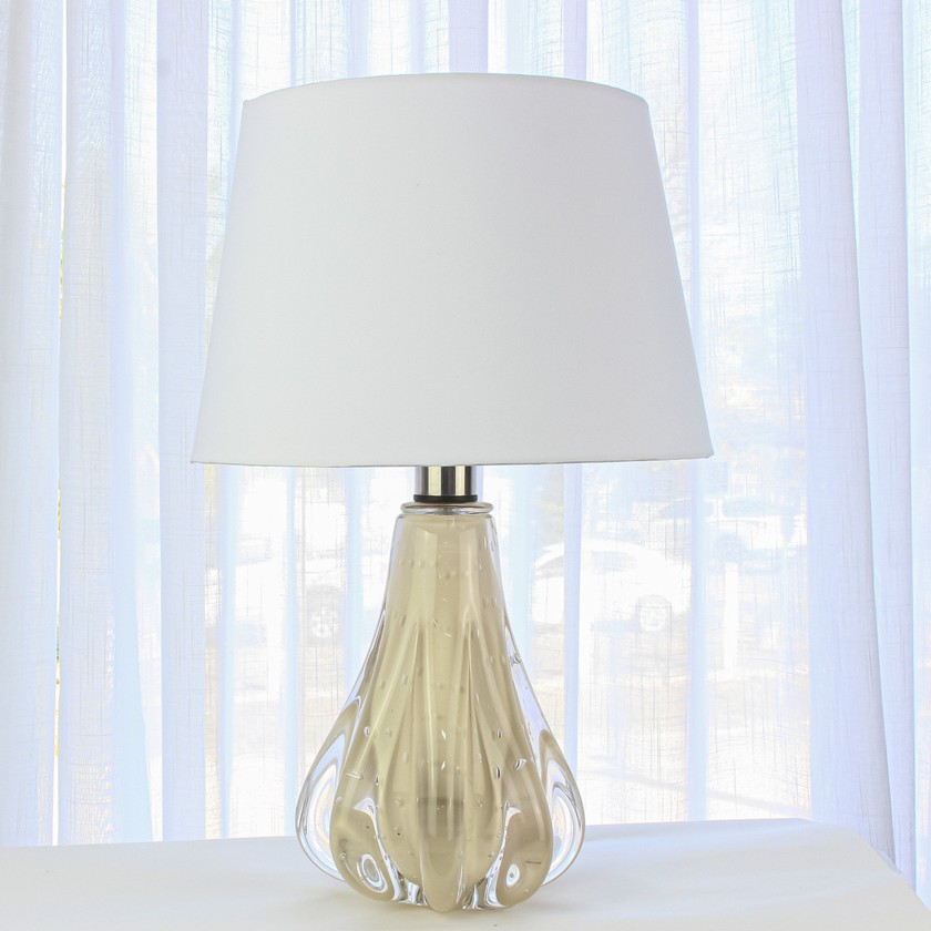 Abajur com base em cristal de murano, tamanho pequeno, produzido artesanalmente à mão, traz sofisticação e luxo para o seu ambiente. O modelo Galli tem um design clássico e atemporal, fácil de compor o seu décor.