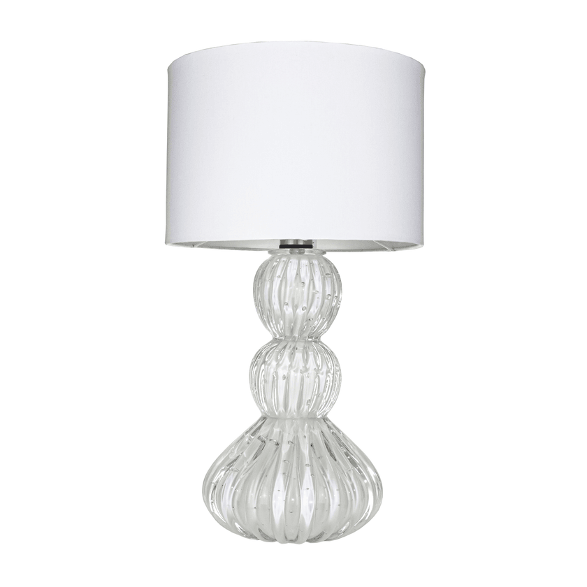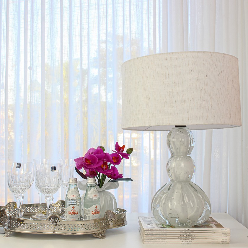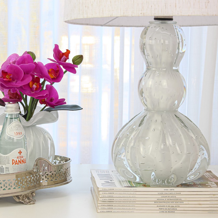 Abajur com base em cristal de murano, tamanho pequeno, produzido artesanalmente à mão, traz sofisticação e luxo para o seu ambiente. O modelo Viena tem um design clássico e atemporal, fácil de compor o seu décor.