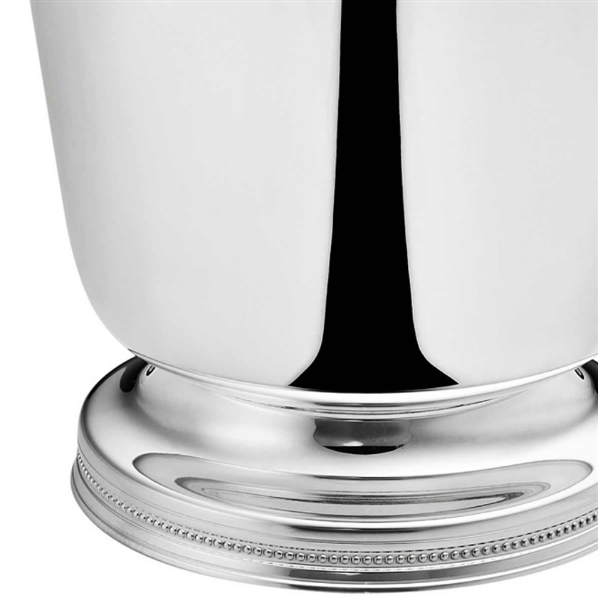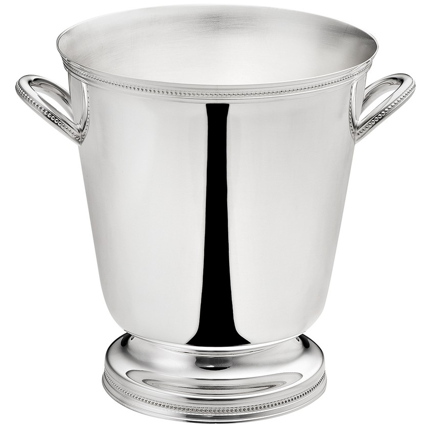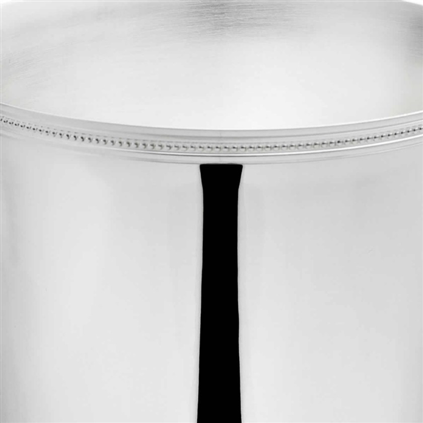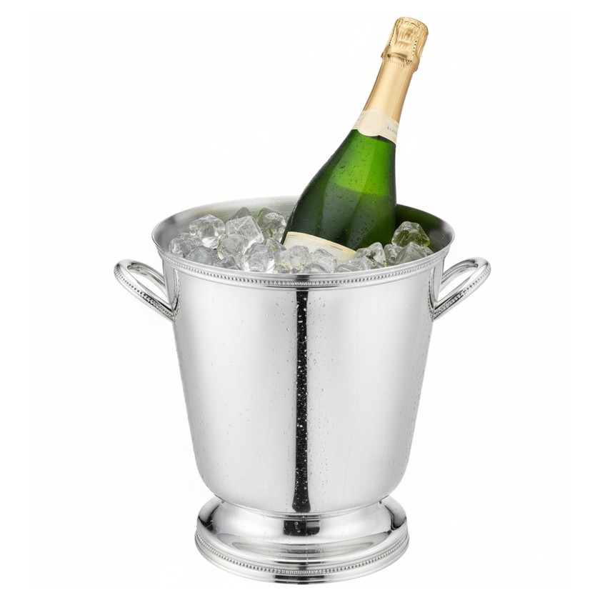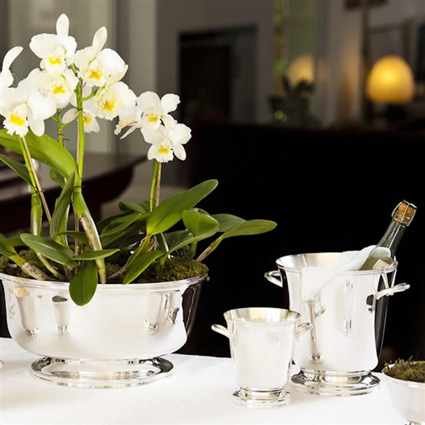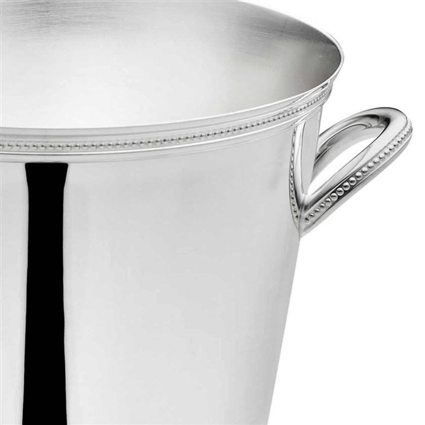 Apresentamos o balde de garrafa Bloom banhado a prata no aço 18/10 inoxidável, com capacidade de 4.5L. A peça perfeita para quem busca unir sofisticação e praticidade em suas celebrações. Com 2 alças laterais facilitando o manuseio, e design elegante acompanhado do detalhamento perola, nas alças, pé e borda do balde.