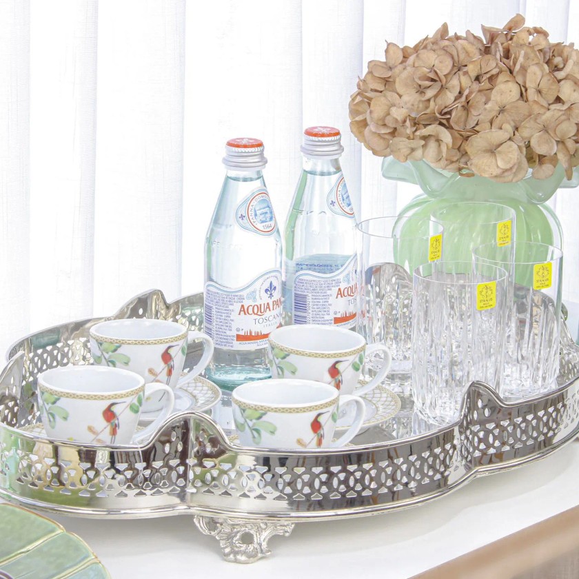 A Bandeja Bali possui um perfeito acabamento e um belo designer. Ideal para preparar aquela bandeja bar ou se deliciar com um bom café/chá durante o dia. Decore e sirva com muito charme. Seu material em Zamac lhe proporciona uma bela aparência, além de maior resistência à oxidação e ao desgaste.