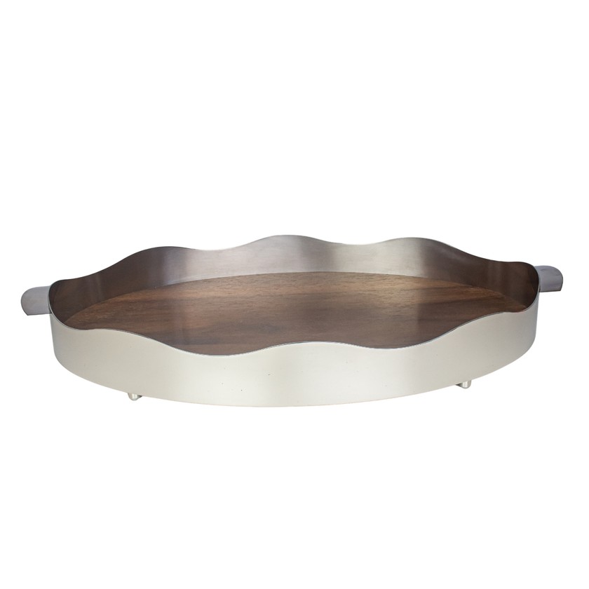 A bandeja oval de aço inóx 18/10, sendo de facil manutenção, com fundo amadeirado trazendo praticidade e sofisticação, e alças de aba reta facilitando o manuseio. Ideal para compor o seu decorar e servir com elegância.