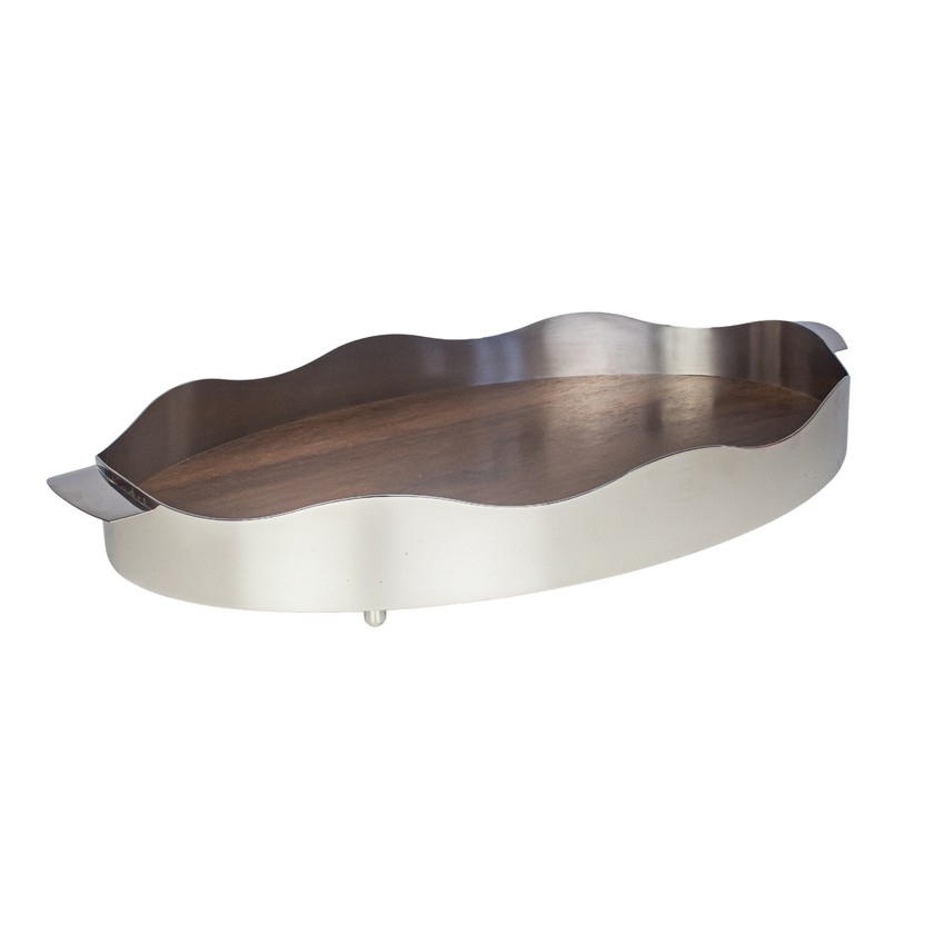 Bandeja Galeria Lisa Oval Média Aço Inox com Fundo de Madeira St James