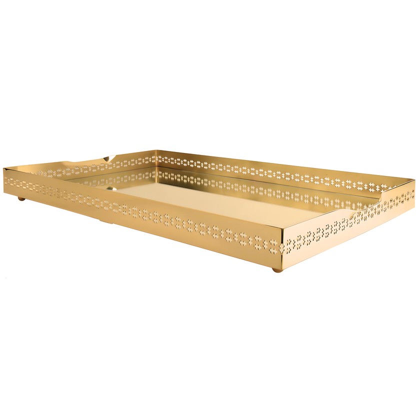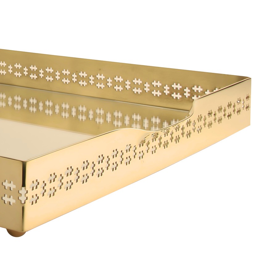 Deslumbrante e requintada, a bandeja retangular banhada a ouro 24K, com fundo espelhado trazendo sofisticação a composição, alças na lateral da peça, e detalhe cross em torno da bandeja. Ideal para compor o seu decorar e servir com elegância.