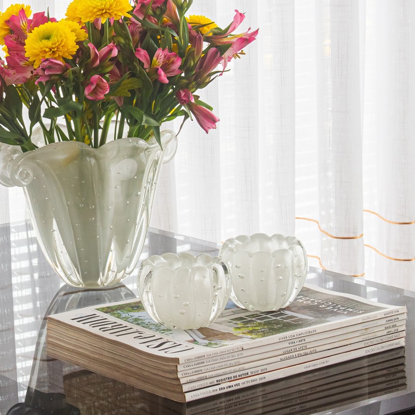 O cachepot Liceu em Cristal de Murano de tamanho mini é perfeito para decorar a sua mesinha de cabeceira ou mesa de centro, também podendo ser usado para servir petiscos a mesa deixa uma apresentação mais sofisticada e única.