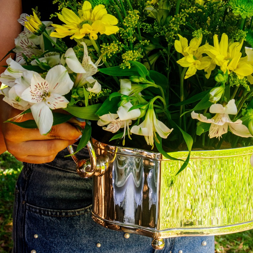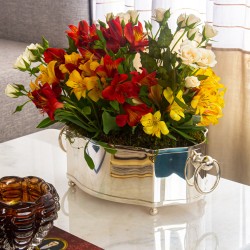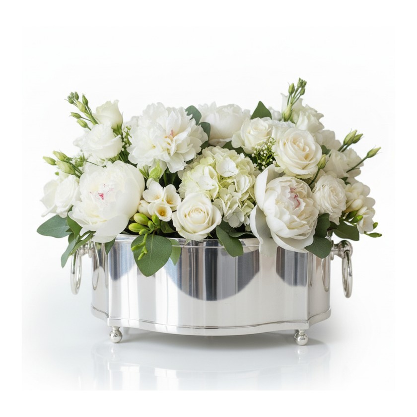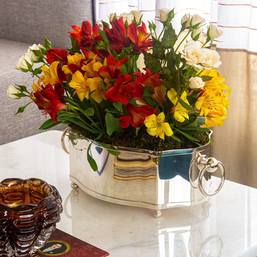 Deslumbrante e moderno, o centro de mesa banhado a prata no aço 18/10 inoxidável, com designe atemporál e versátil, alças laterais estendidas facilitando o manuseio. Ideal para compor o seu decorar com arranjos florais, trazendo elegância ao seu ambiente.