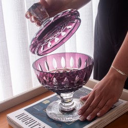 Deslumbrante e moderna. A compoteira possui cristal 24% de chumbo que garante brilho, transparência e pureza. Peça feita artesanalmente a sopro e lapidada a mão, do pegador na tampa ao pé, com bojo arredondado e generoso. Ideal para compor sua mesa de centro ou aparador, com pequenos doces. Transforme o seu servir e eleve a sua decoração com estas joias.