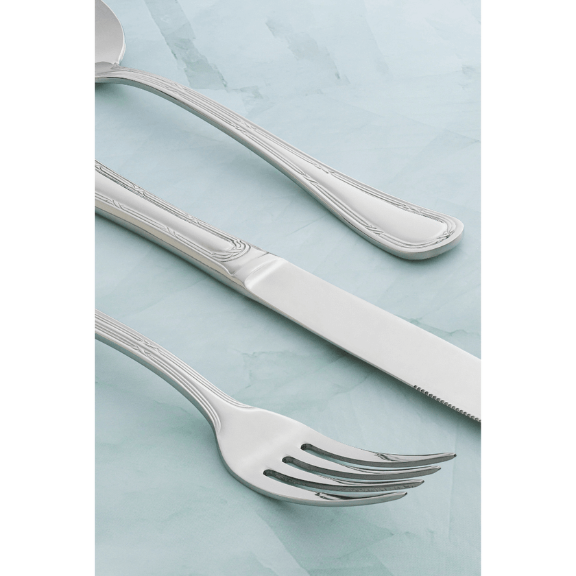 Serviço para até 12 pessoas: 12 garfos de mesa, 12 colheres de mesa, 12 facas de mesa, com o cabo inteiriço, 12 garfos de sobremesa, 12 colheres de sobremesa, 12 facas de sobremesa, com o cabo inteiriço, 12 colheres de chá, 12 colheres de café, 1 colher de arroz, 1 concha, 1 garfo para salada, 1 colher para salada, 1 colher de açúcar.