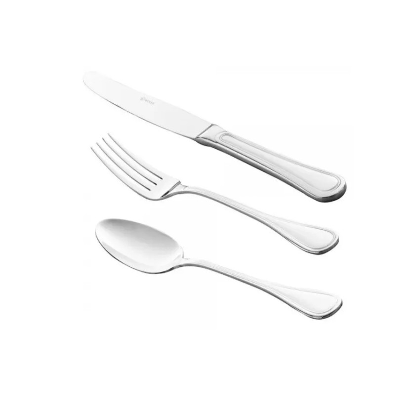 Composto por 30 peças, sendo 06 colheres de mesa, 06 garfos de mesa, 06 facas de mesa, 06 garfos para sobremesa e 06 colheres para sobremesa.
