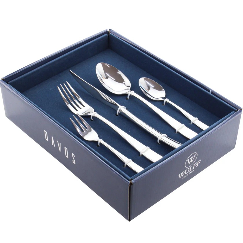 Composto por 30 peças, sendo 06 colheres de mesa, 06 garfos de mesa, 06 facas de mesa, 06 garfos para sobremesa e 06 colheres para sobremesa.