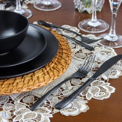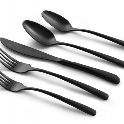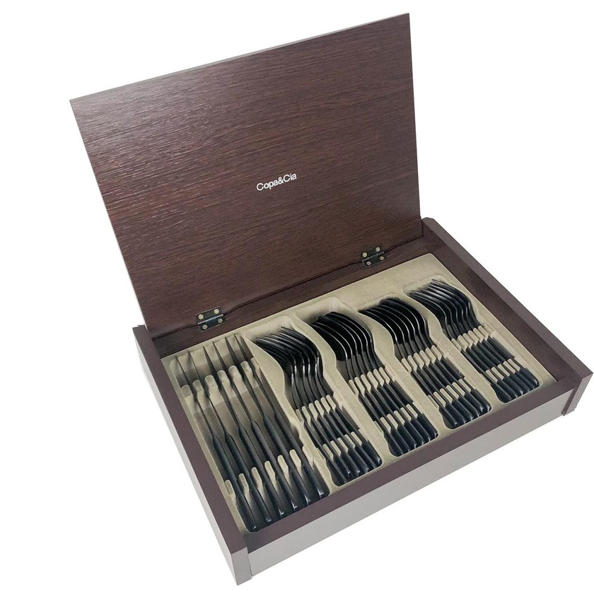 Acabamento PVD titânio, agregando proteção extra contra os riscos e corrosão. Este jogo contém 06 garfos de mesa, 06 facas de mesa, 06 colheres de mesa, 06 garfos de sobremesa e 06 colheres de sobremesa. Possui embalagem especial em caixa de MDF.
