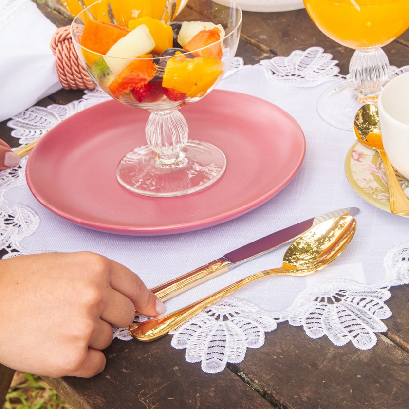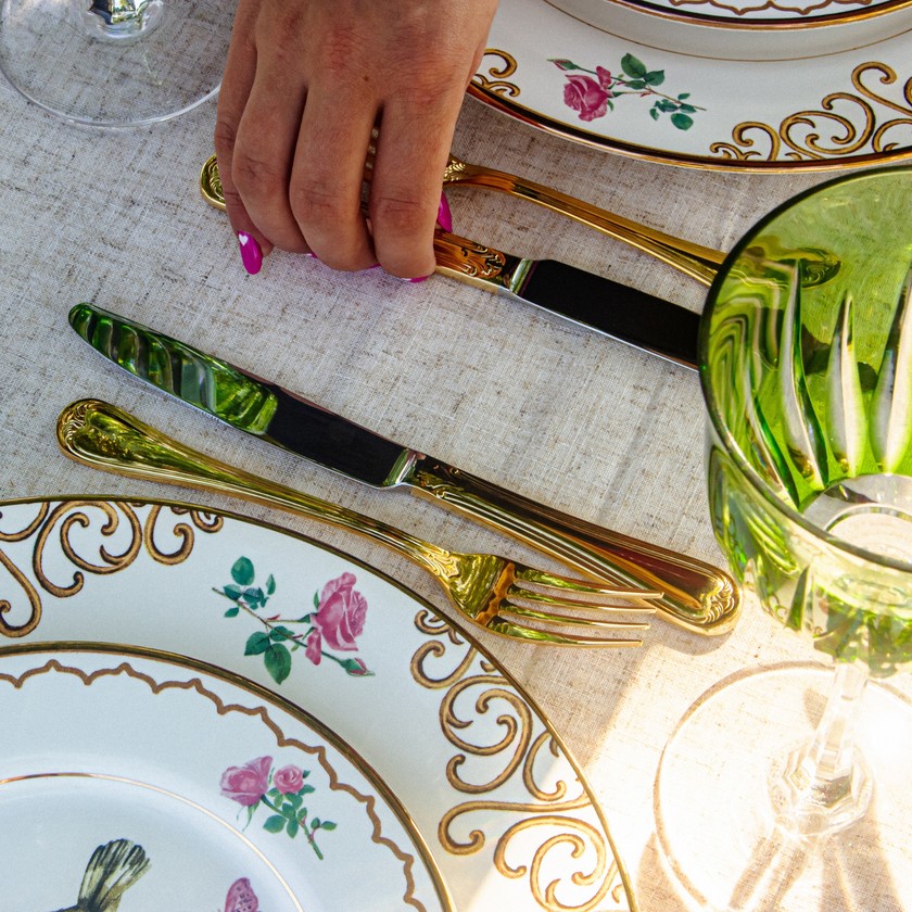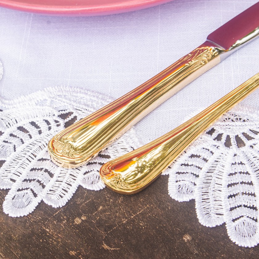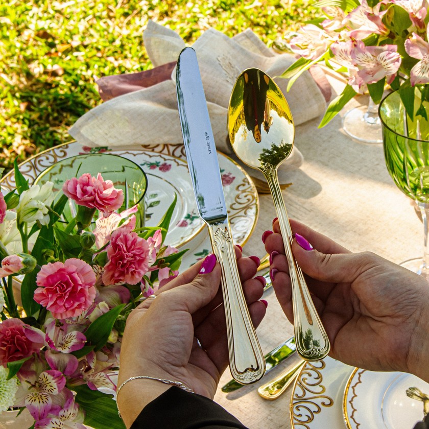 O Faqueiro St. James 48 Peças em Ouro 24K é uma combinação perfeita de design, resistência e qualidade. Atende aos mais elevados padrões mundiais. É produzido em ouro 24K, o que há de melhor em qualidade, garantindo maior durabilidade e facilidade na manutenção, possuindo um acabamento impecável e excelente apresentação. As facas possuem lâminas temperadas, que mantêm o corte por mais tempo e não causam riscos nas superfícies dos pratos, conservando-os sempre bonitos. São peças que te proporciona uma presença marcante, dá um toque de classe e requinte às ocasiões formais, é indispensável para abrilhantar sua mesa.