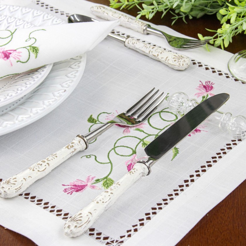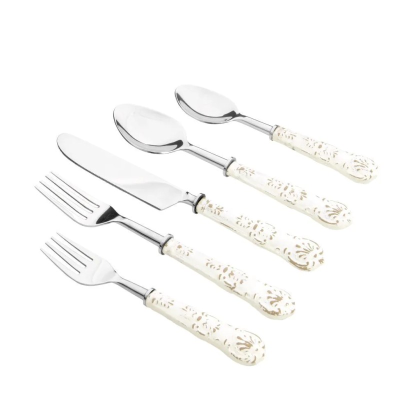 Composto por 30 peças, sendo 06 colheres de mesa, 06 garfos de mesa, 06 facas de mesa, 06 garfos para sobremesa e 06 colheres para sobremesa.