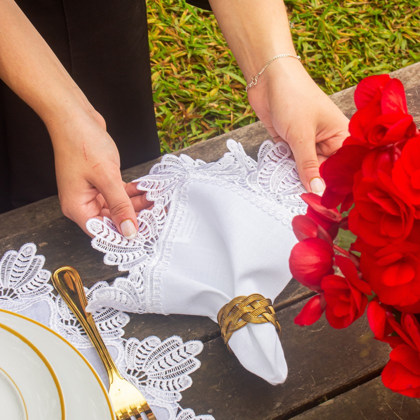 Em mesas de jantar, especialmente em celebrações especiais como casamentos, aniversários ou jantares formais, os guardanapos com acabamento em renda Guipir se destacam por sua beleza e sofisticação. Eles podem ser coordenados com outros elementos decorativos, como jogos americanos, toalhas de mesa, centros de mesa e até mesmo a louça, criando uma harmonia visual que impressiona os convidados. Por exemplo, ao combiná-los com uma toalha de mesa de linho branco e talheres de prata, a renda Guipir ganha ainda mais destaque, permitindo que seus detalhes intrincados capturem a atenção e adicionem um toque de glamour à mesa.