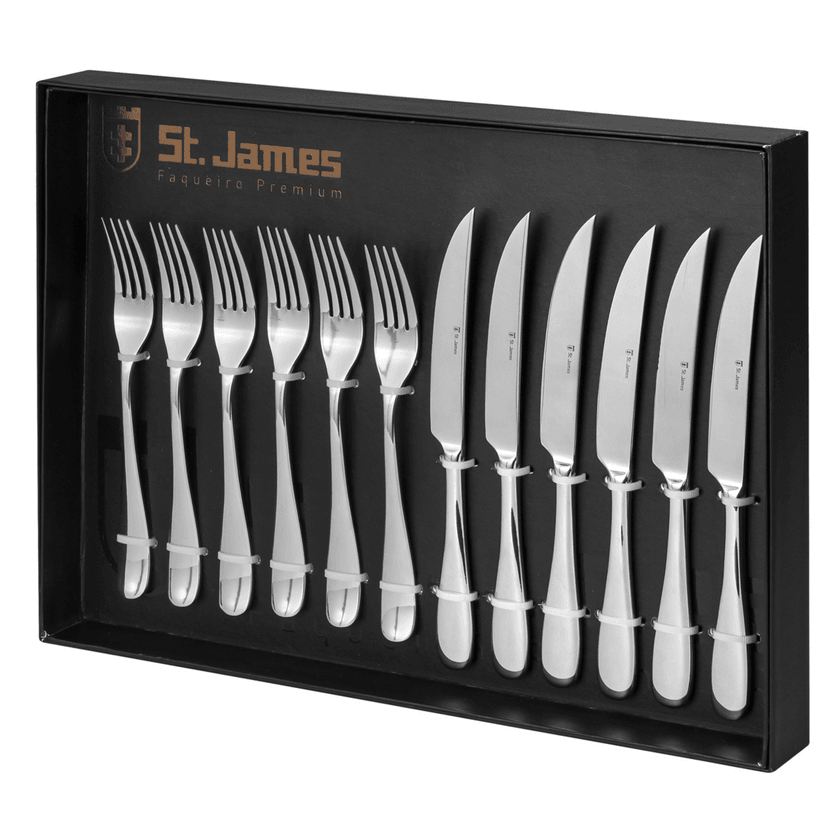 O kit para churrasco St. James 12 Peças em aço inox 18/10 é uma combinação perfeita de design, resistência e qualidade. Atende aos mais elevados padrões mundiais. O que há de melhor em qualidade, garantindo maior durabilidade e facilidade na manutenção, possuindo um acabamento impecável e excelente apresentação. As peças possuem lâminas temperadas, que mantêm o corte por mais tempo e não causam riscos nas superfícies dos pratos, conservando-os sempre bonitos. São peças que te proporciona uma presença marcante, dá um toque de classe e requinte às ocasiões formais, é indispensável para abrilhantar sua mesa.