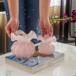 Clássico e aconchegante, o kit de vasos Leida em cristal de murano, com detalhes de pinças na borda da peça feitas por verdadeiros artistas. Modelo trouxinha em um kit com duas peças, compondo seu ambiente com delicadeza e suavidade. Eleve seu ambiente com a beleza e requinte dos cristais.