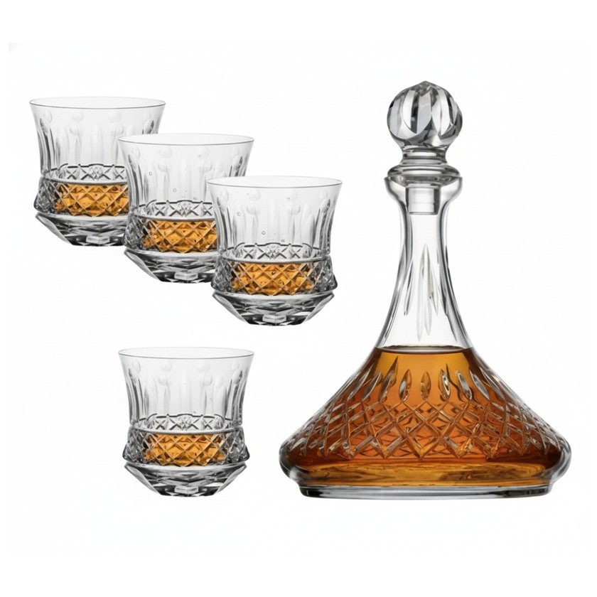 Moderno e sofisticado, o kit de whisky possui cristal 24% de chumbo que garante brilho, transparência e pureza. Kit composto por quatro unidades do copo de whisky na lapidação 69 com 325ml de capacidade, e uma garrafa de whisky na lapidação 89, com 1200ML de capacidade. Feitas artesanalmente a sopro e lapidadas a mão por verdadeiros artistas. Transforme o seu servir e eleve a sua decoração com estas joias.