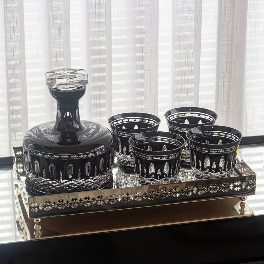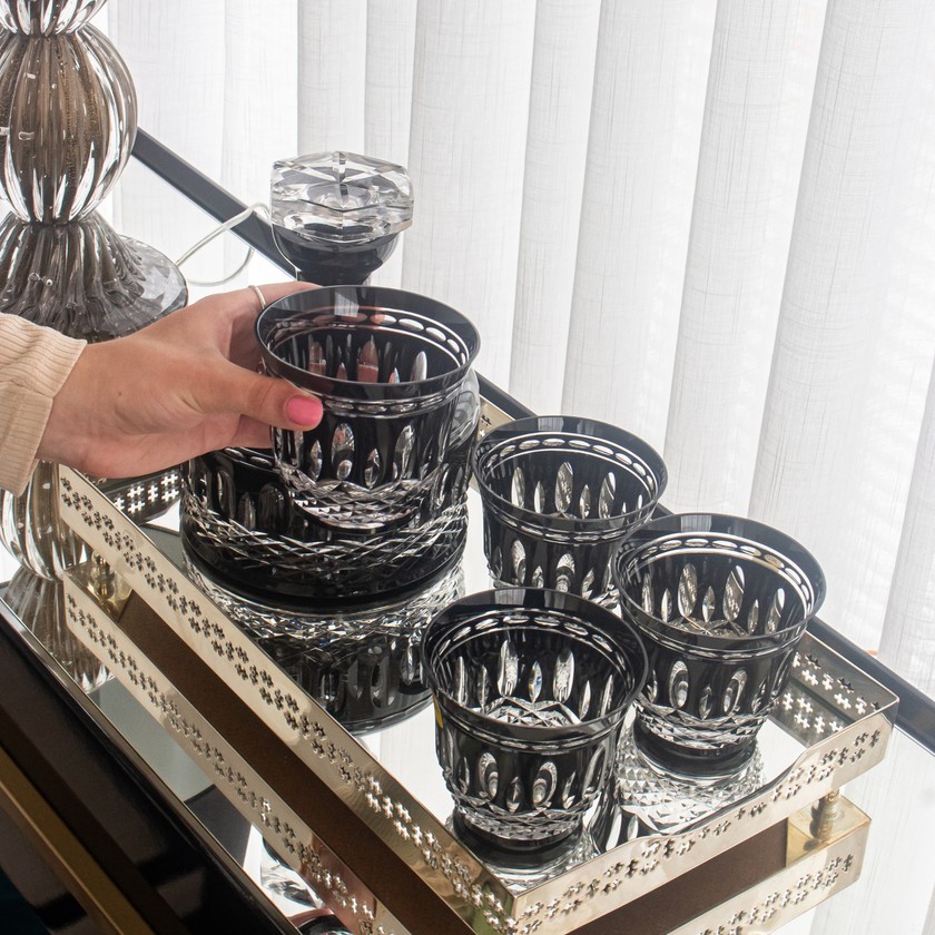 Moderno e sofisticado, o kit é composto por 4 copos de whisky, com capacidade de 320ML, e 1 garrafa de whisky com capacidade de 1200ML. São peças de cristal puro com 24% de chumbo, o que garante brilho, transparência e pureza, feitas artesanalmente a sopro e lapidados a mão. Sirva sua bebida favorita com a elegância do cristal.