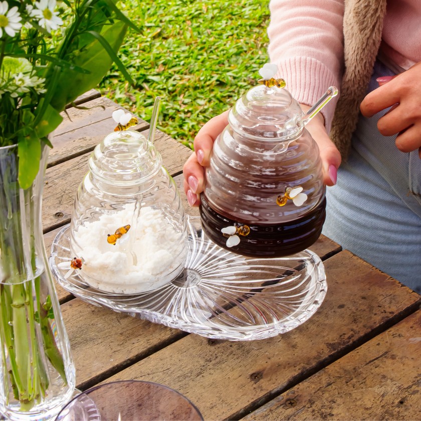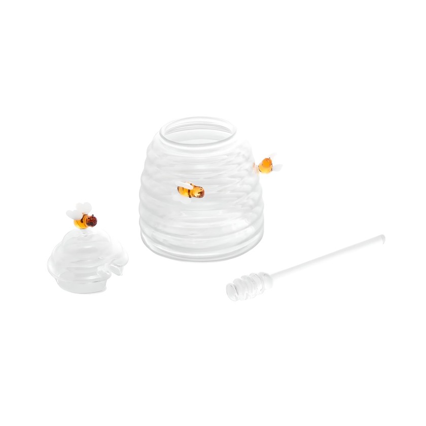 Acompanhando este belo objeto, a colher delicada e bem proporcionada se encaixa perfeitamente, proporcionando uma experiência de colher e servir que é ao mesmo tempo fluida e graciosa. A abelhinha, repousando serenamente no topo, simboliza a jornada de flor em flor, um gentil lembrete da naturalidade e do amor envolvido na criação de cada gota de mel.