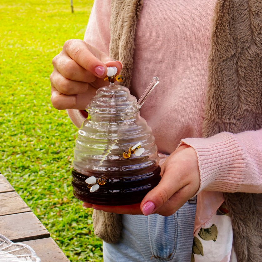 A resistência do vidro borossilicato promete segurança e durabilidade, enquanto sua transparência impecável permite que cada fio de mel dance à luz, criando um espetáculo fluido e encantador. A tampa, adornada com uma encantadora abelhinha esculpida, traz uma pitada de charme rústico, como uma homenagem aos artesãos da natureza.