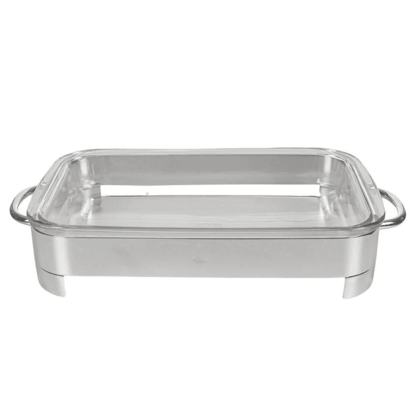 Clássico e elegante, o porta pirex banhado a prata no aço 18/10 inoxidável, é composto por uma assadeira retangular com capacidade de 2,9L e o suporte de prata que traz sustentação e praticidade. Pés elevados e alças laterais estendidas auxiliando no manuseio. Ideal para compor o seu decorar e servir com elegância.