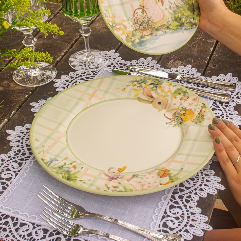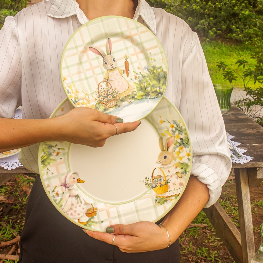 Características: Material de Qualidade: Fabricado em cerâmica de alta qualidade, garantindo durabilidade e resistência para o uso diário e em ocasiões especiais. Tema de Páscoa: Decorado com motivos típicos da Páscoa, como coelhinhos, ovos coloridos, flores primaveris e detalhes em pastel que evocam frescor e renovação.