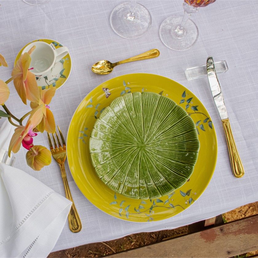 Modelo que além de trazer a função de prato para sobremesa, ainda pode ser usado como para petisqueira para servir e seu modelo único de desenho é peça de destaque para mesa posta.