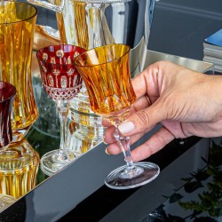 A taça para licor Flauta na lapidação 66 possui cristal 24% de chumbo que garante brilho, transparência e pureza, ela tem capacidade de 80ml. Disponível em cores exclusivas derivadas da técnica overlay, são peças feitas artesanalmente a sopro, modernas e sofisticadas. Transforme o seu servir e eleve a sua decoração com estas joias.