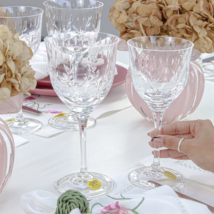Uma lapidação que traz ao modelo a delicadeza e suavidade das flores através de pequenos ramos orgânicos, proporcionando ao cristal ainda mais graciosidade. As taças de vinho são desenvolvidas para potencializar os aspectos do vinho, como aroma, textura e cor.
