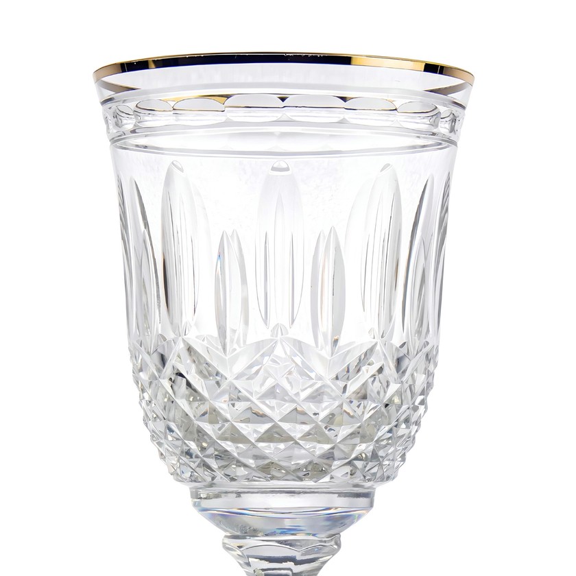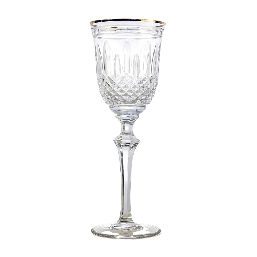 Deslumbrante e luxuosa. A taça para vinho com borda filetada a ouro 24K, possui cristal 24% de chumbo que garante brilho, transparência e pureza. Ela tem capacidade de 270ml, peça feita artesanalmente a sopro e lapidada a mão. Transforme o seu servir e eleve a sua decoração com estas joias.