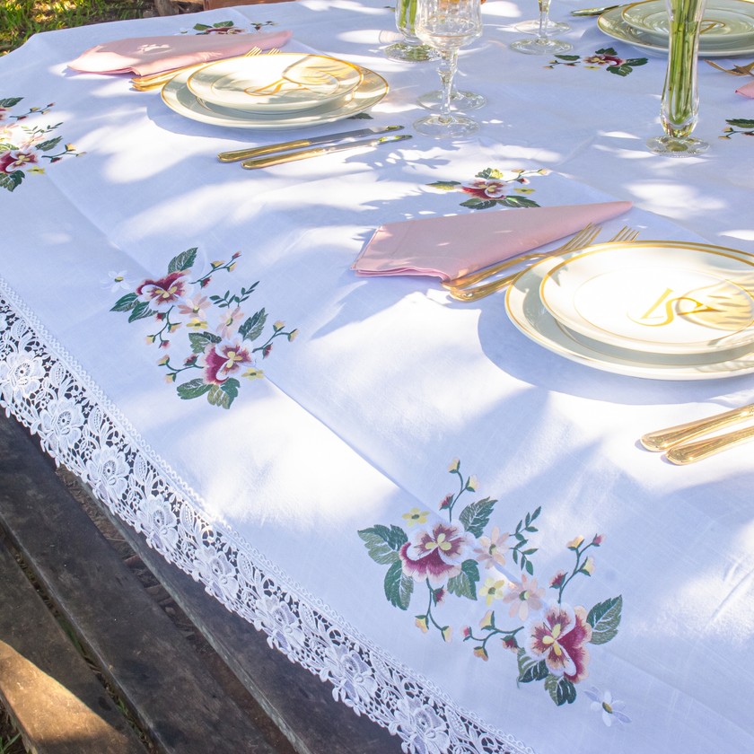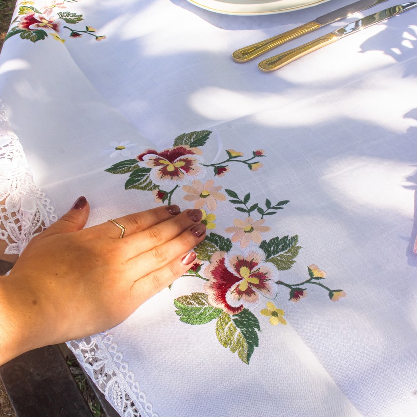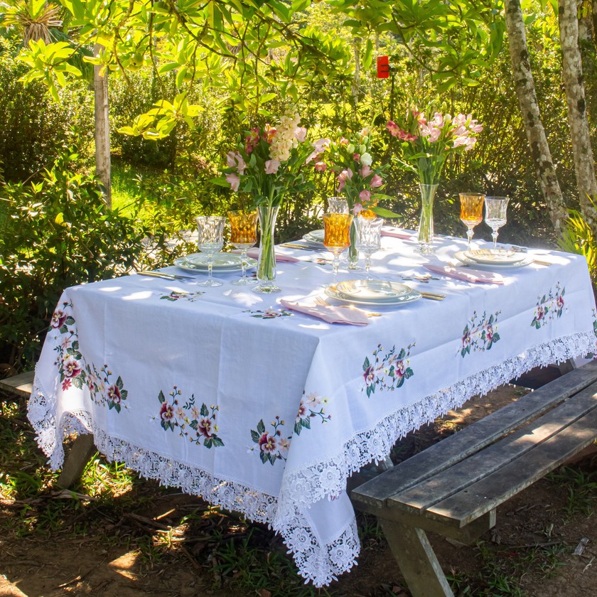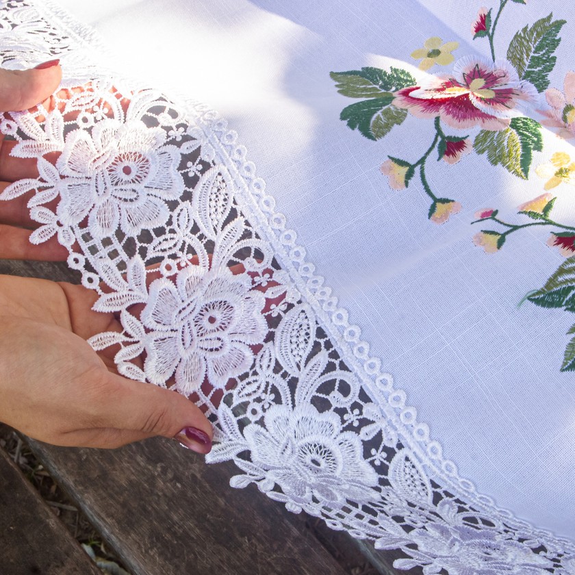 Charmosa e elegante, a toalha de mesa Jardim, com acabamento em renda gipir nas laterais, composto por 100% de poliéster, com toque e aparência do linho. Modelo ideal para compor a sua mesa posta, celebrando cada momento especial. Compondo seu ambiente com delicadeza e suavidade. Eleve seu ambiente com a beleza e requinte das roupas de mesa bordadas.