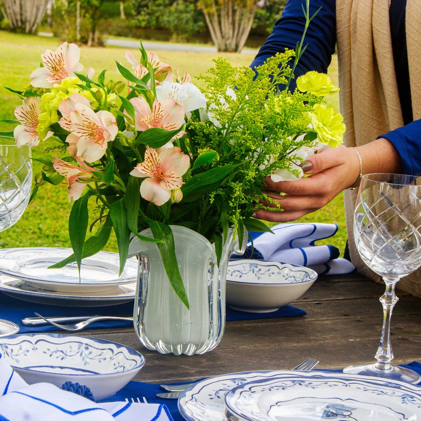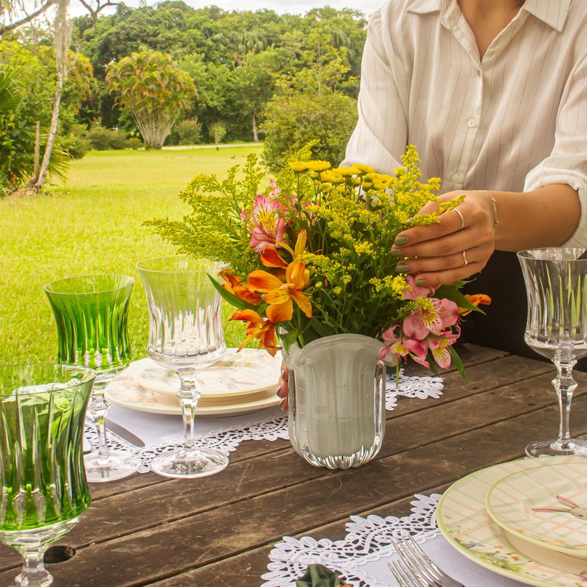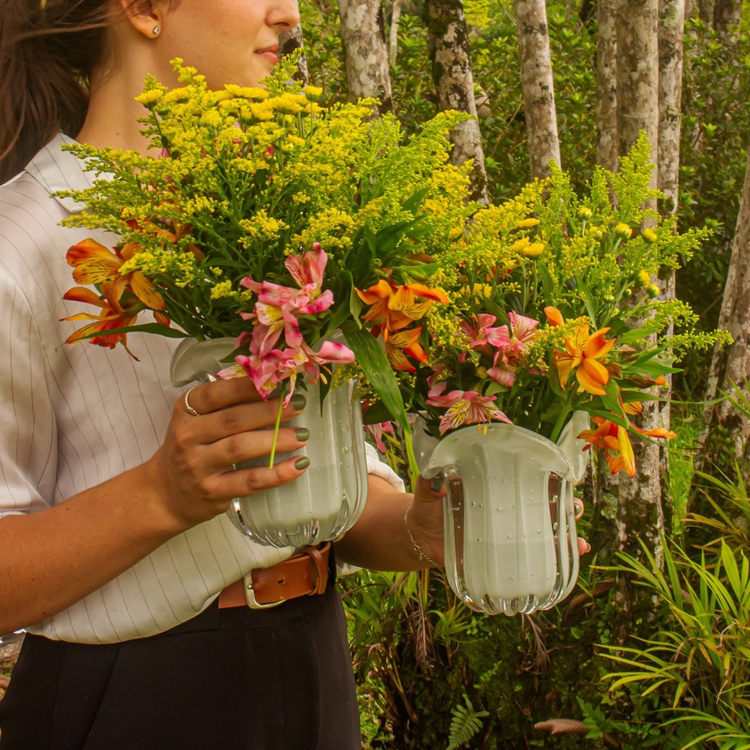 Vaso de murano modelo Naty, com tamanho de 15cm de altura e formato de trouxinha, ideal para arranjos florais e composição de mesas postas