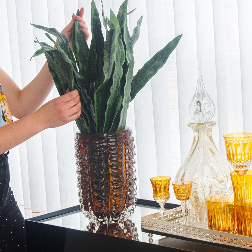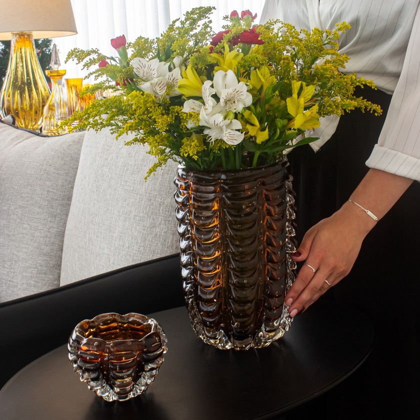 O vaso Leeds em cristal de Murano traz o que tem de mais clássico e sofisticado, com formato cilindro, além de decorar seu ambiente, ele pode ser facilmete usado para organização da sua mesa, cabeceira e lavabos.