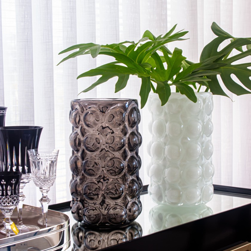 Vaso de Murano Moab, com seu formato alongado com aproximadamente 30cm de altura e modelo com esferas em alto relevo , ideal para arranjos florais e composição de mesas postas
