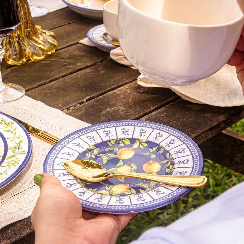 Entre as folhas, pequenos arabescos dourados cruzam a superfície do pires, refletindo a luz de maneira sutil e realçando o tema siciliano. A alça da xícara, fina e ligeiramente curva, é pintada à mão com uma linha dourada, ecoando o requinte dos artefatos artesanais mediterrâneos.
